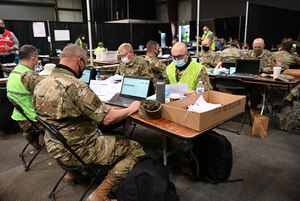 Multiple Airmen from the 173rd Fighter Wing update a computer data system with vaccine information March 21, 2021 at the Jackson County Fairgrounds in Central Point, Oregon. Oregon Air National Guardsmen from Kingsley Field were one of the many groups of uniformed service members volunteering to